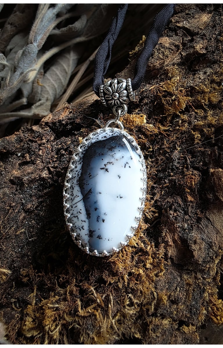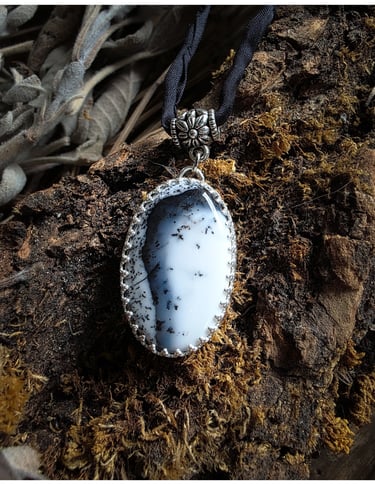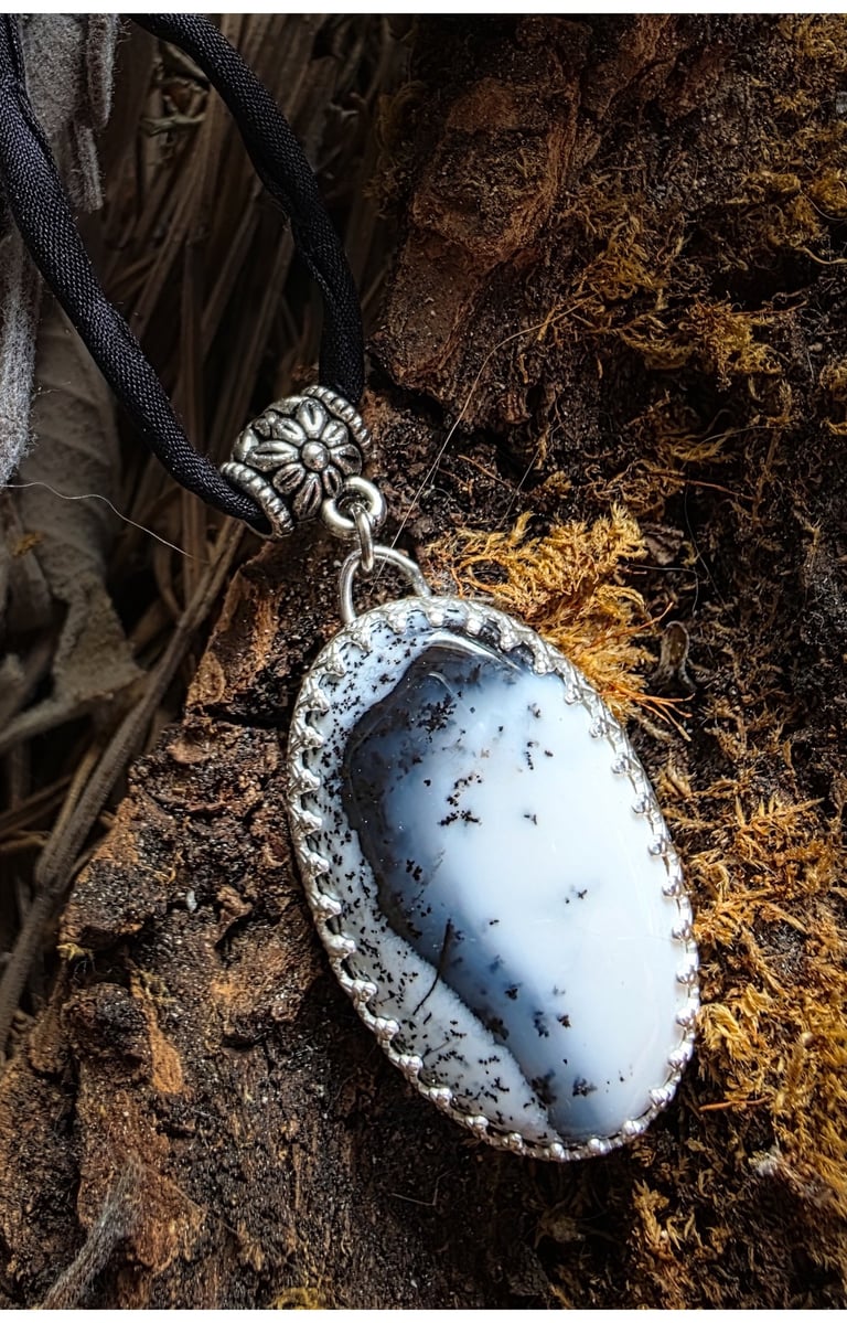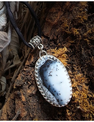 Inspiriert von der Stille schneebedeckter Berge und dem Schimmer eisiger Landschaften. Ein Dendritenopal, umhüllt von Silber, fängt die Stille und Magie des Nordens ein.